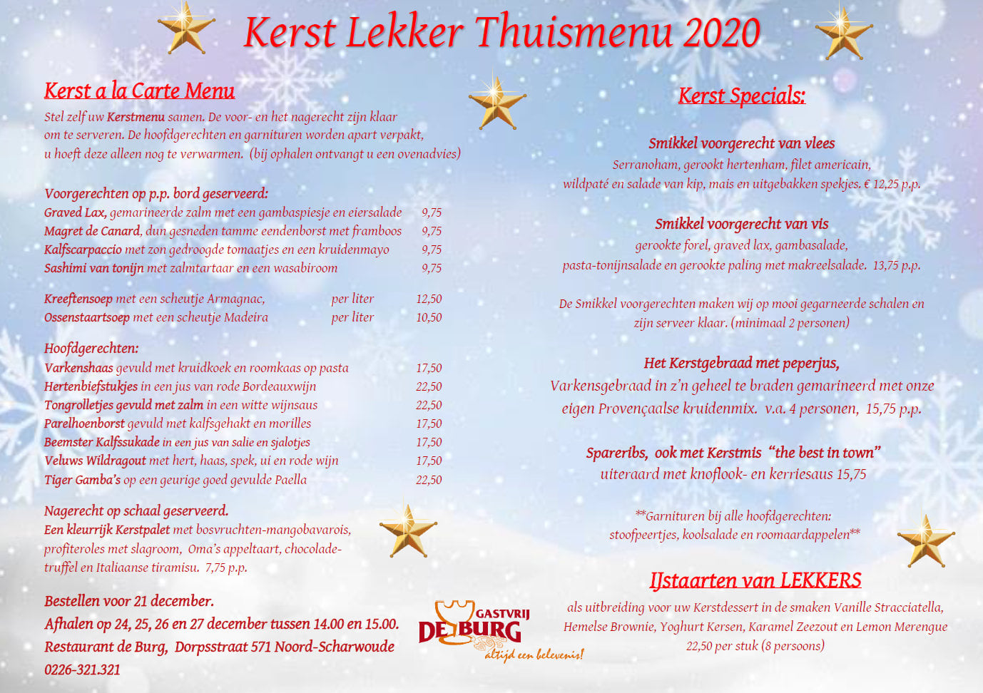 U kunt bestellen voor 24- 25- 26 en 27 december dus 4 dagen feest!! Bel 0226-321.321 of mail naar ton@deburg.nl