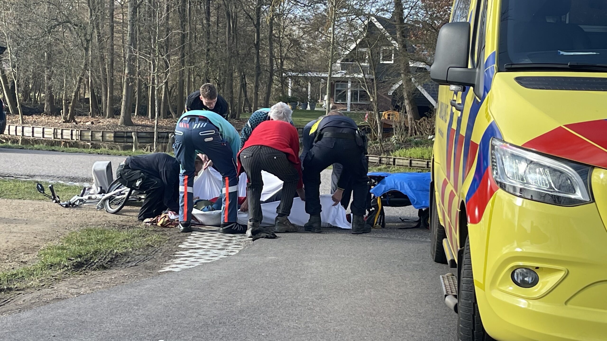 De auto is over de fiets gereden en heeft bij de klap zijn spiegel verloren en zijn voorband lek gereden. De vrouw is overgebracht naar het ziekenhuis.