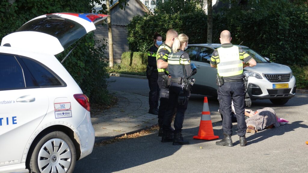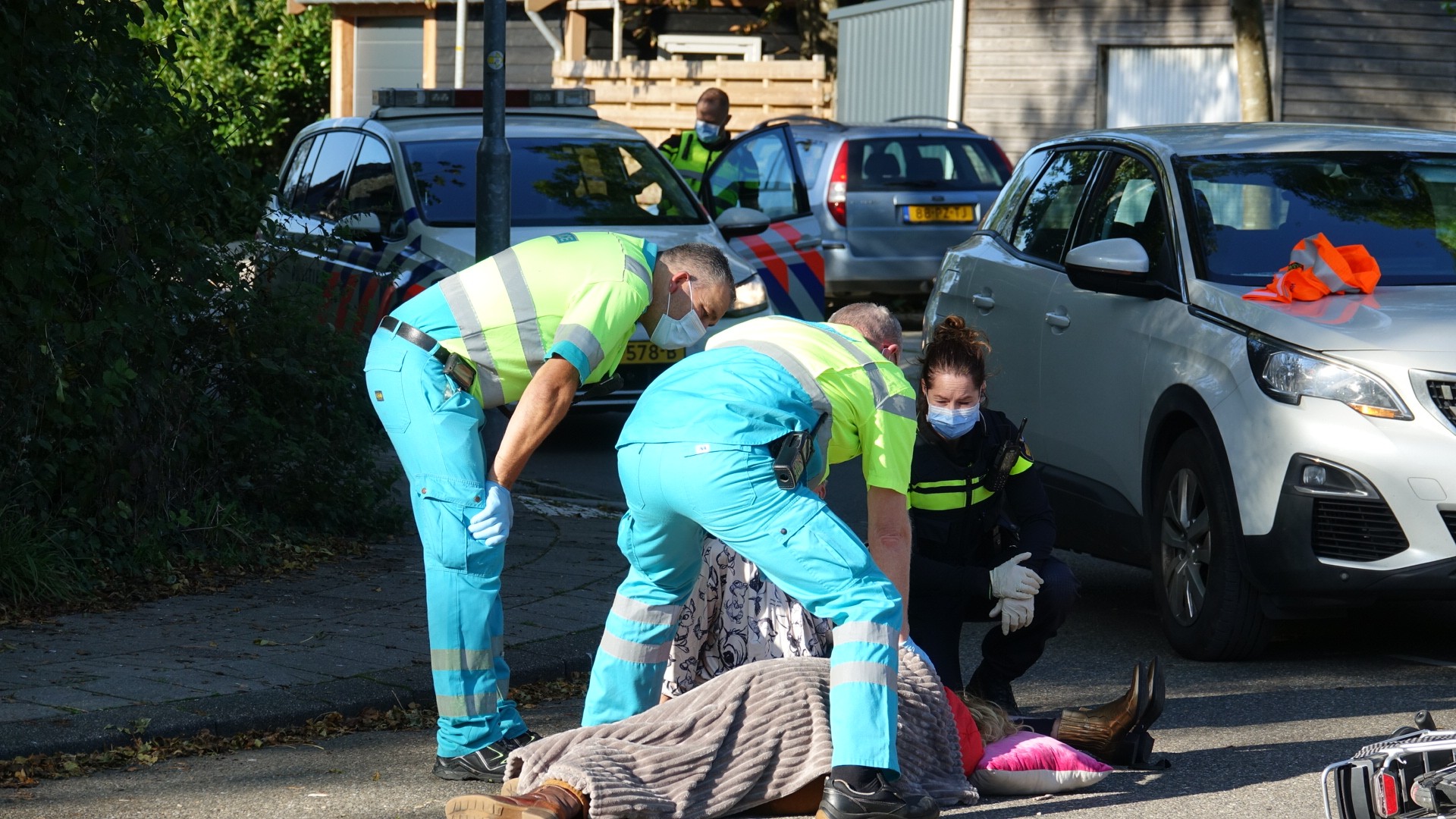 De vrouw is ongelukkig gevallen en word nagekeken in de ambulance.