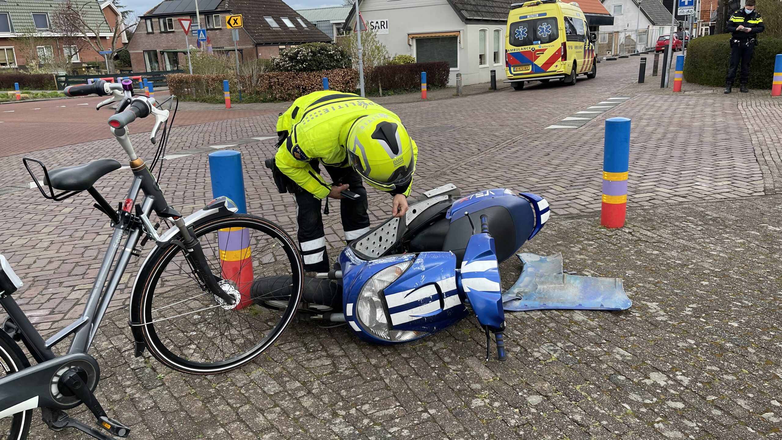 Noord-Scharwoude: Op de dorpstraat heeft vanmorgen een ongeval plaatsgevonden tussen een scooterrijder en een auto. De auto kwam uit de doorbraak en reed richting de Tulpenstraat, de scooter kwam vanaf het zuiden aangereden en kon de auto niet meer ontwijken.