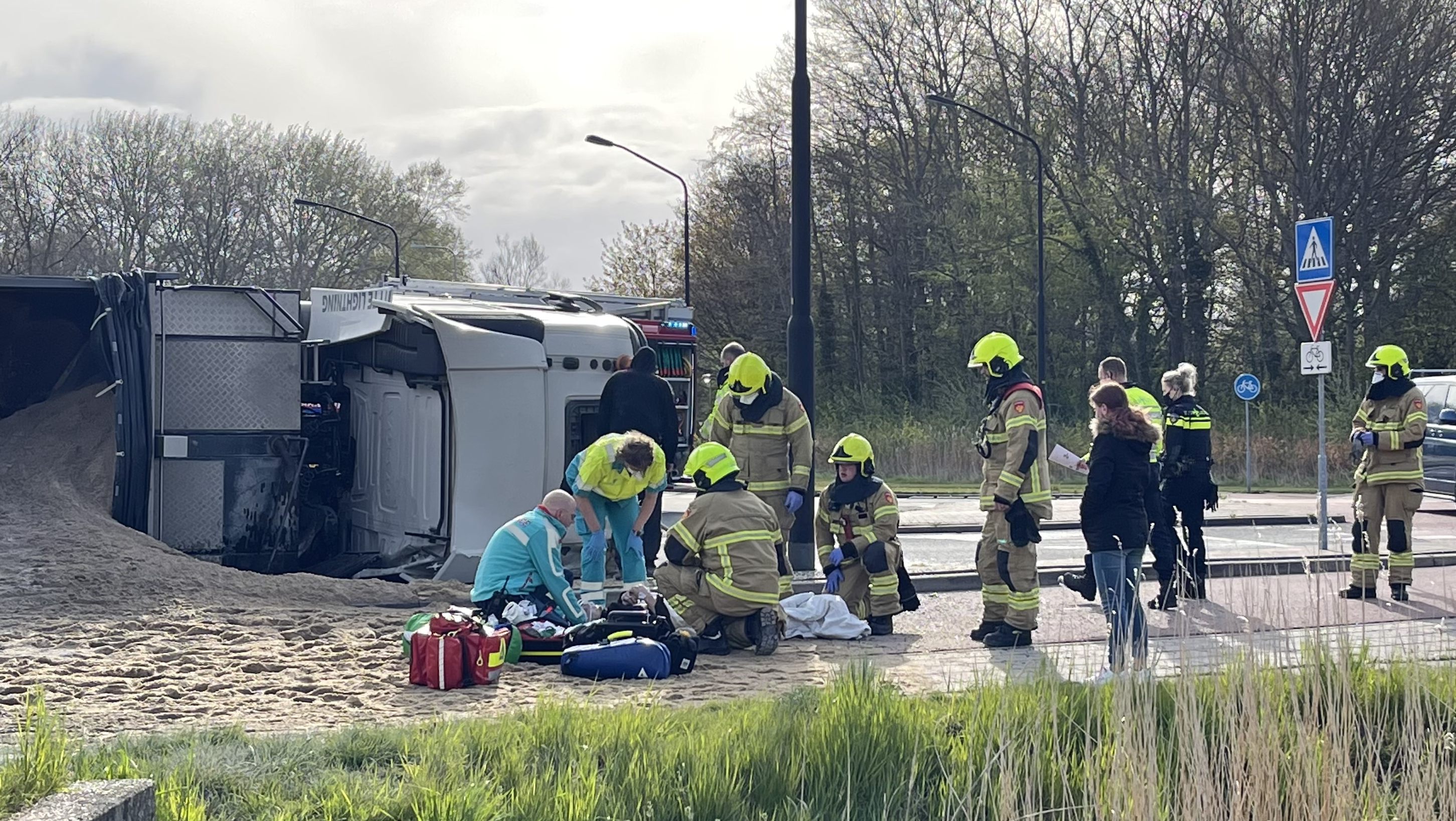 Heerhugowaard: Op de Krusemanlaan in Heerhugowaard heeft woensdagochtend een eenzijdig ongeval plaatsgevonden. Een vrachtwagen volgeladen met zand en specie is op de rotonde gekanteld. De vrachtwagen heeft zijn lading verloren op de weg en het fietspad die naast de rotonde ligt. Een agent die bezig is met zijn opleiding zag het ongeluk voor zich gebeuren en twijfelde geen moment en heeft snel de hulpdiensten opgetrommeld.